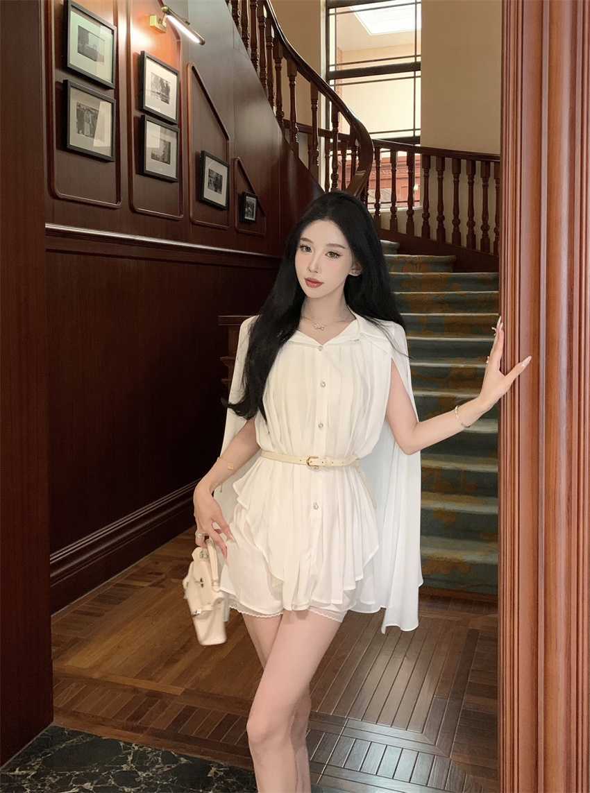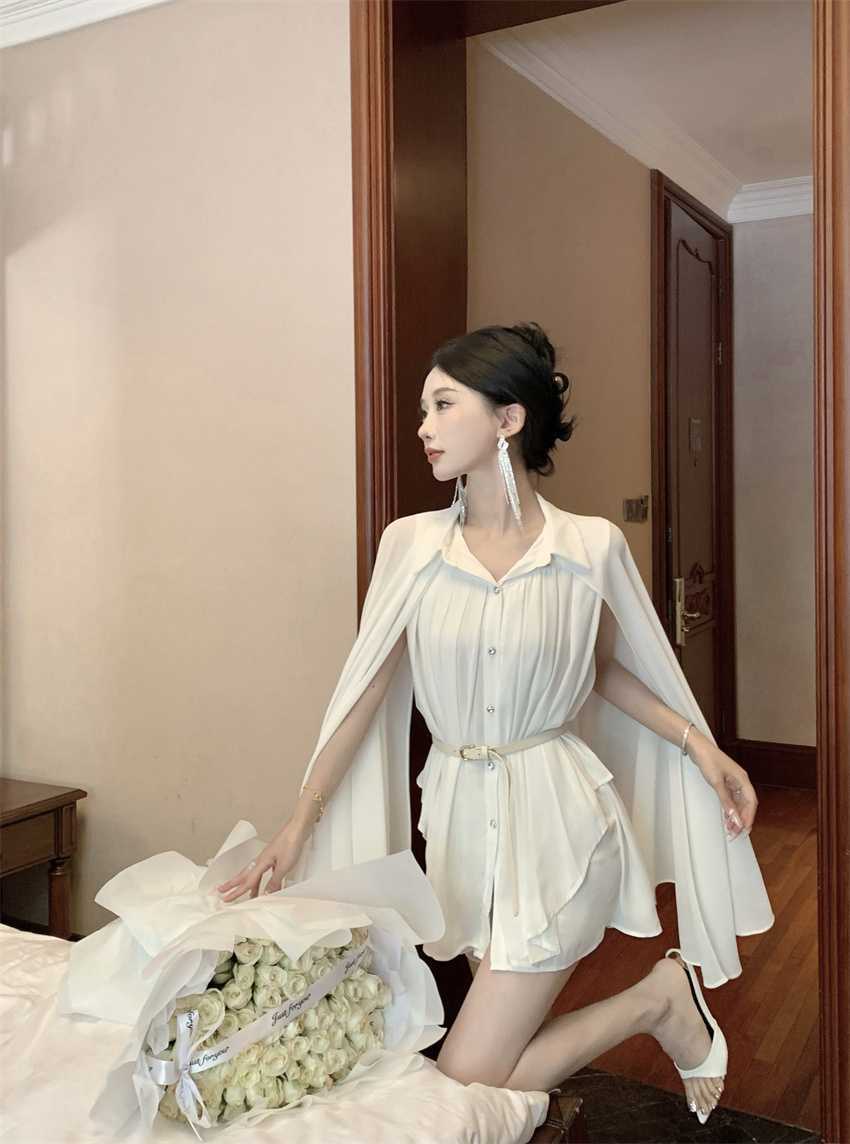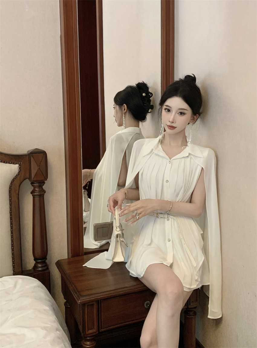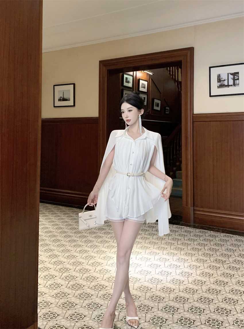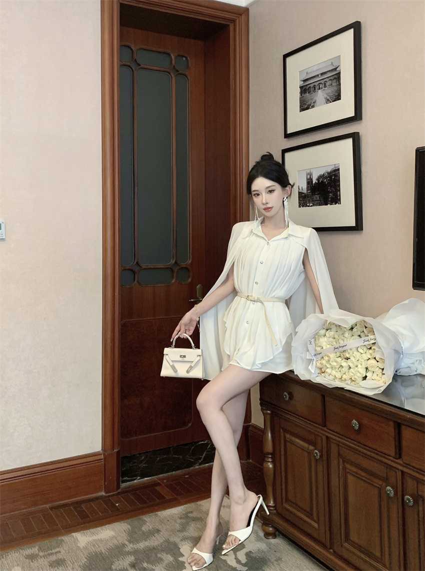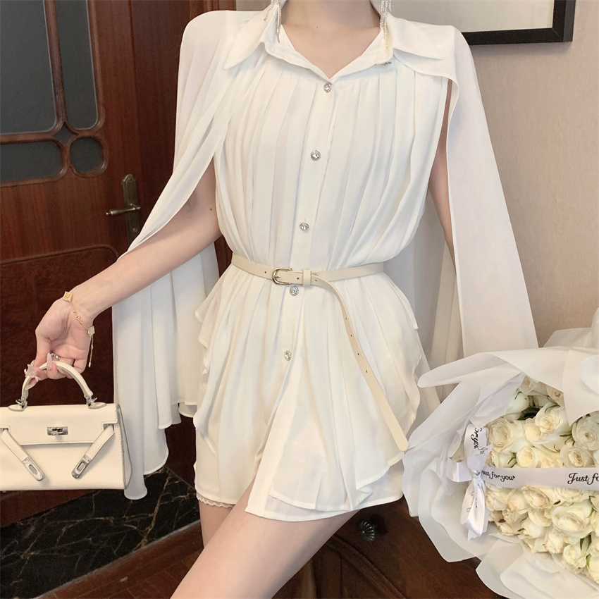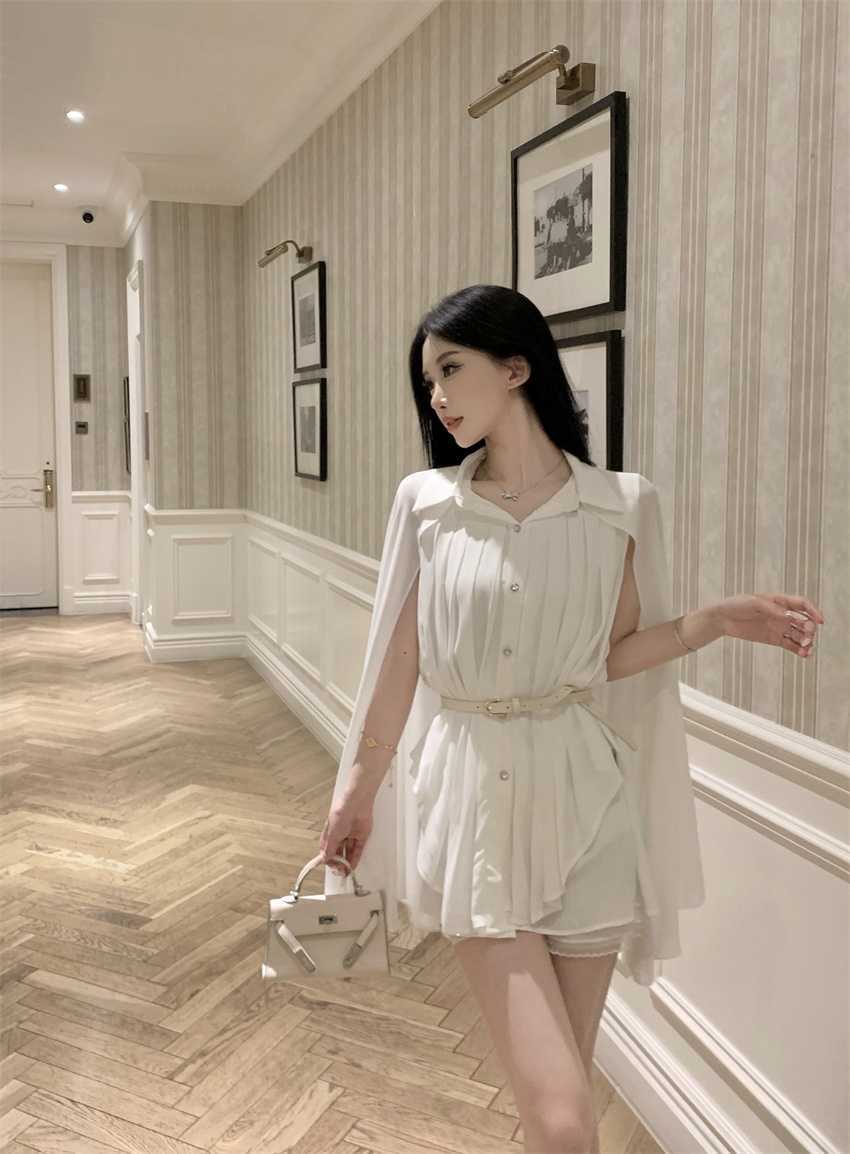 White Cloak Shawl Chiffon Pleated Shirt With Belt