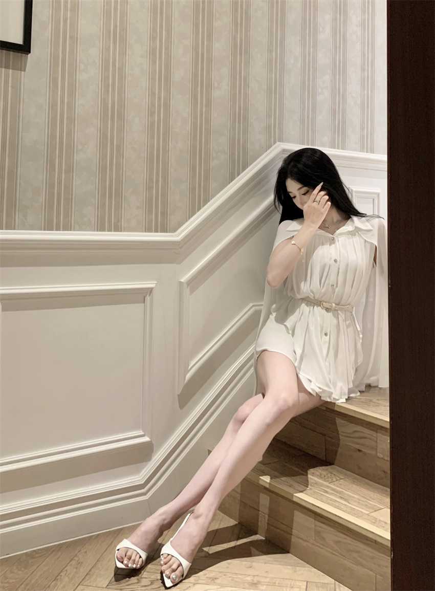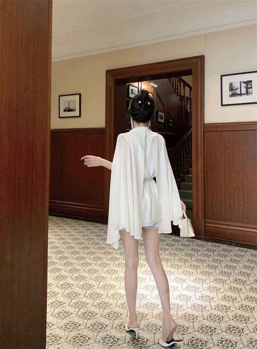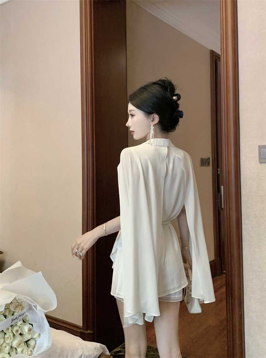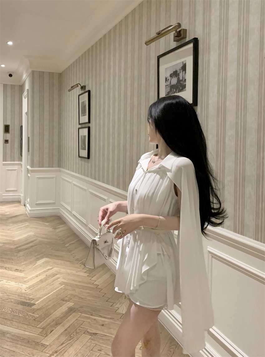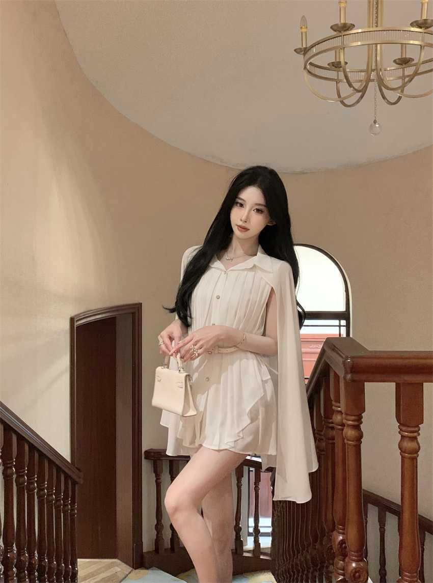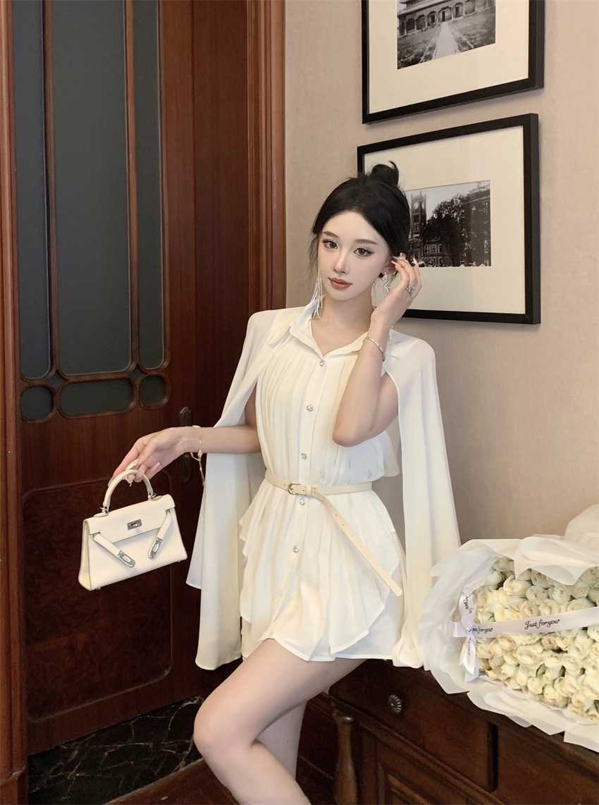 White Cloak Shawl Chiffon Pleated Shirt With Belt